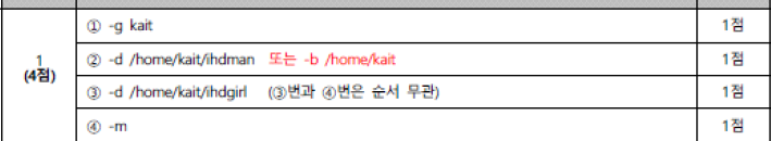 자격증 취득 준비할 겸 포스팅을 합니다.해당 게시글에 문제가 있을 경우 댓글 달아주세요. (수정이 필요한 문구가 있거나, 문제 공유가 불가한 경우 등)설명을 못 쓴 문제가 있으니 참고해주세요. ✅ [1번 예상문제]사전에 ihdgroup 그룹이 사용가능하며, ihdman 계정이 존재하는지 아래와 같이 확인해야한다.grep ihdgroup ① _________ grep ihdman ② _________usermod -aG ihdgroup ihdman 앞으로 사용자 계정 생성시 홈디렉터리에 readme.txt 파일을 추가한다.vi ③ _________ /readme.txt 패스워드 최대 사용일수를 90일로 수정하려한다.vi ④ _________~PASS_MAX_DAYS 90~ 🎯 답..