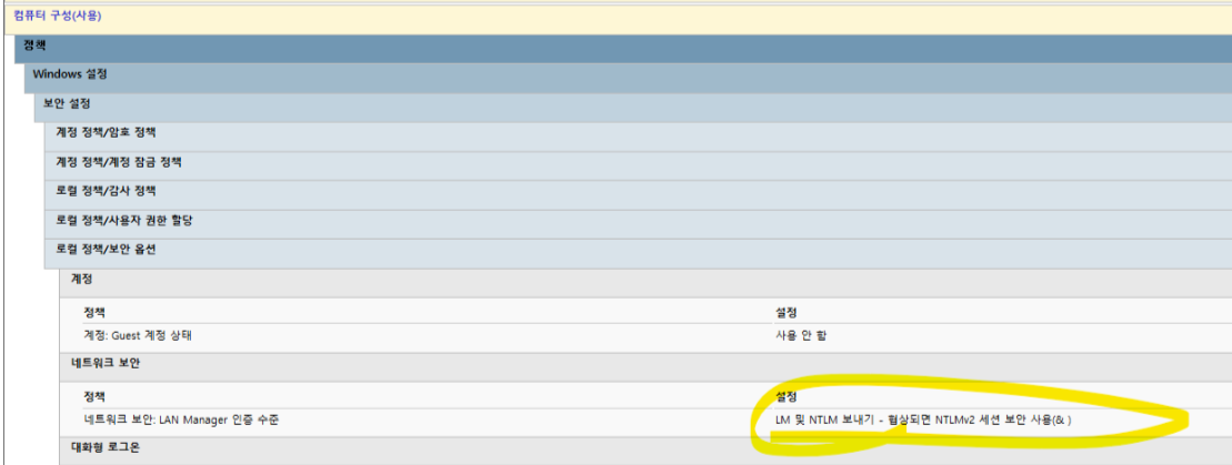 정책 항목: Microsoft 네트워크 보안: NTLM SSP 기반 서버 인증 수준