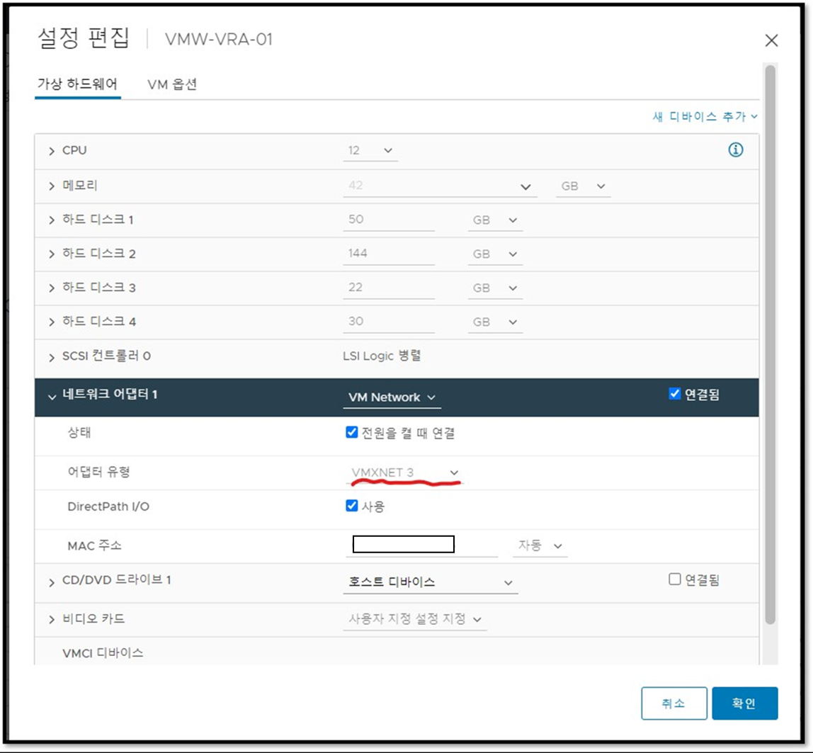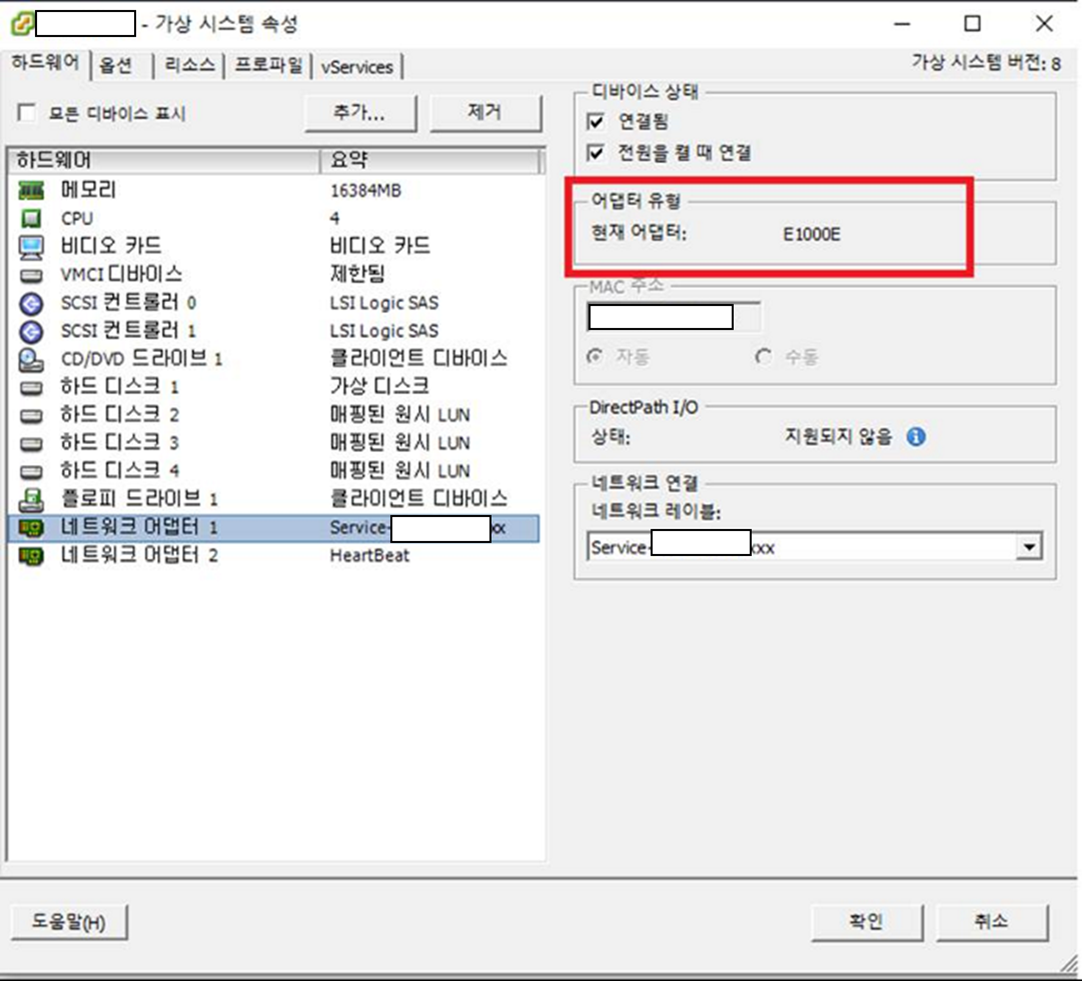 해당 VM의 네트워크 어댑터를 VMXNET3 타입으로 교체하는 것이 권장됨.