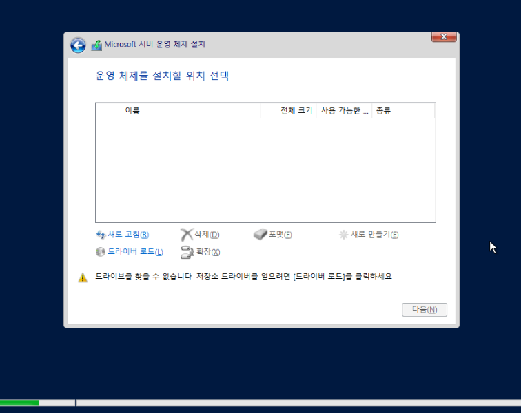 설치 단계에서 “드라이브를 찾을 수 없습니다. 저장소 드라이버를 얻으려면 [드라이버 로드]를 클릭하세요.” 메시지가 뜨는 경우의 원인과 해결 절차를 정리함.