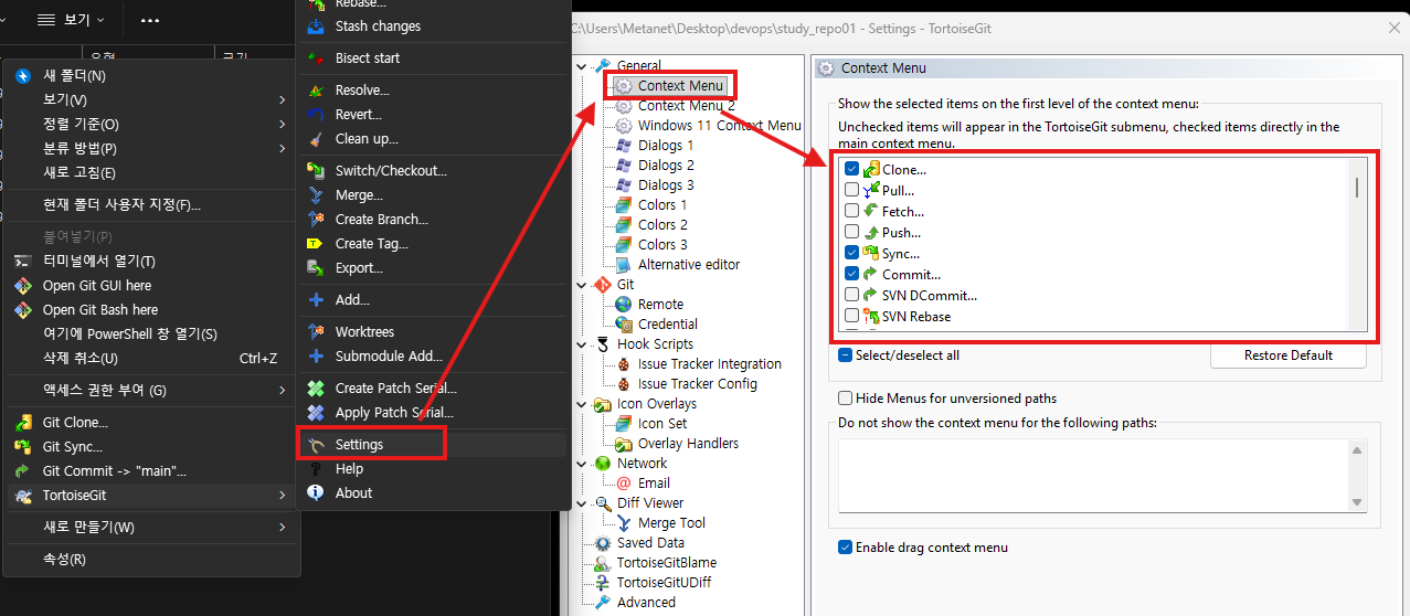 그런데 Tortoisegit 설치 후 Git을 이용하는데 최초 설정 그대로 쓰면 조금 불편하다.