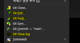 자주 사용하는 commit, push, pull 등이 우클릭 메뉴의 두번째 하위 메뉴에 있어서 사용에 번거로움이 있다.