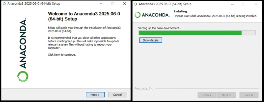 | 기본 포함 | 수백 개 과학 패키지, Jupyter/Lab, Spyder, Anaconda Navigator(GUI), conda | conda + Python(딱 기본만) |
