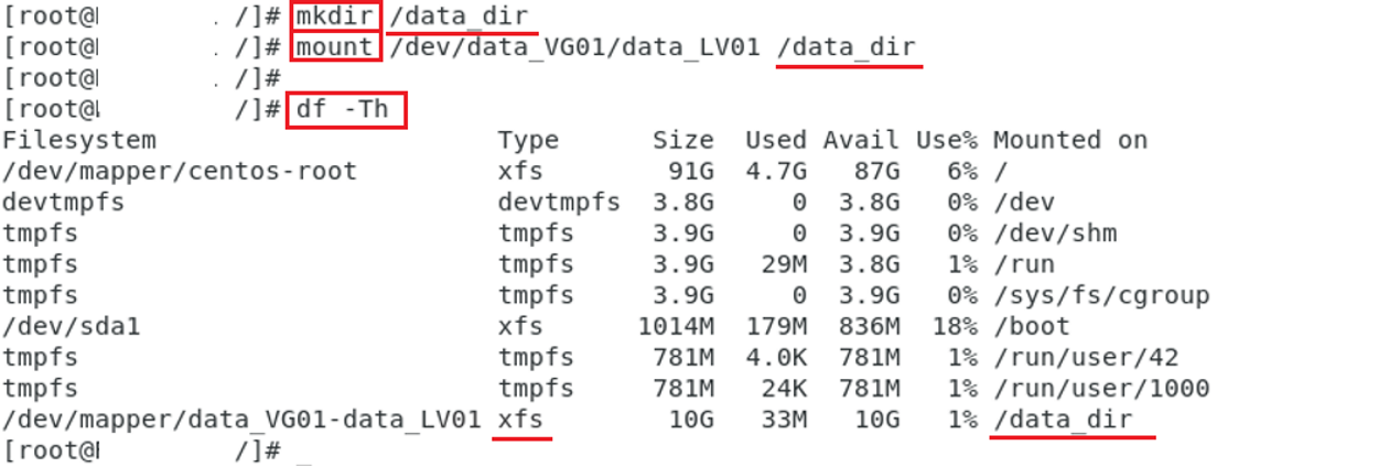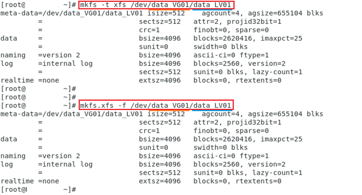 : mkfs -t xfs LV디바이스경로