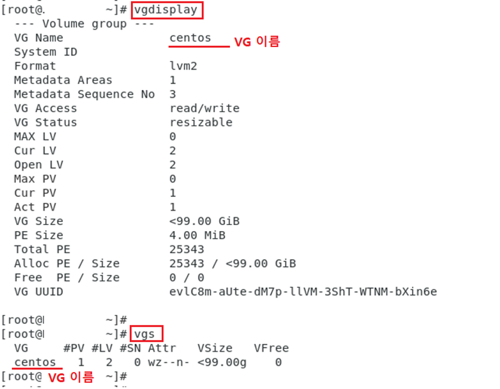 - VG 상태 확인 명령어 : vgdisplay (간단히 보려면 vgs)