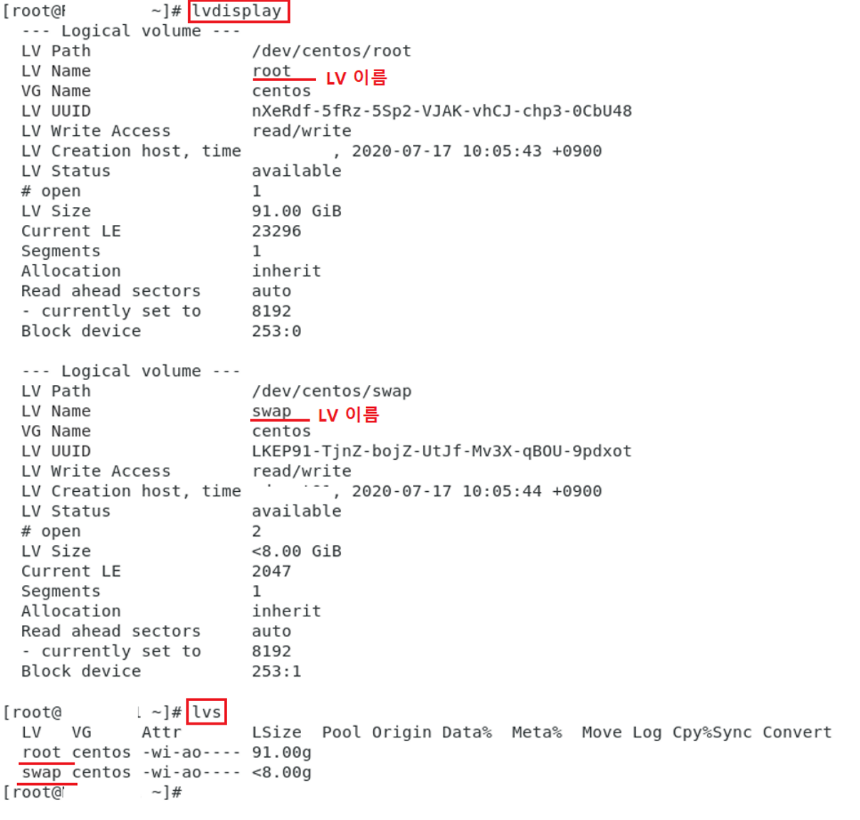 - LV 상태 확인 명령어 : lvdisplay (간단히 보려면 lvs)