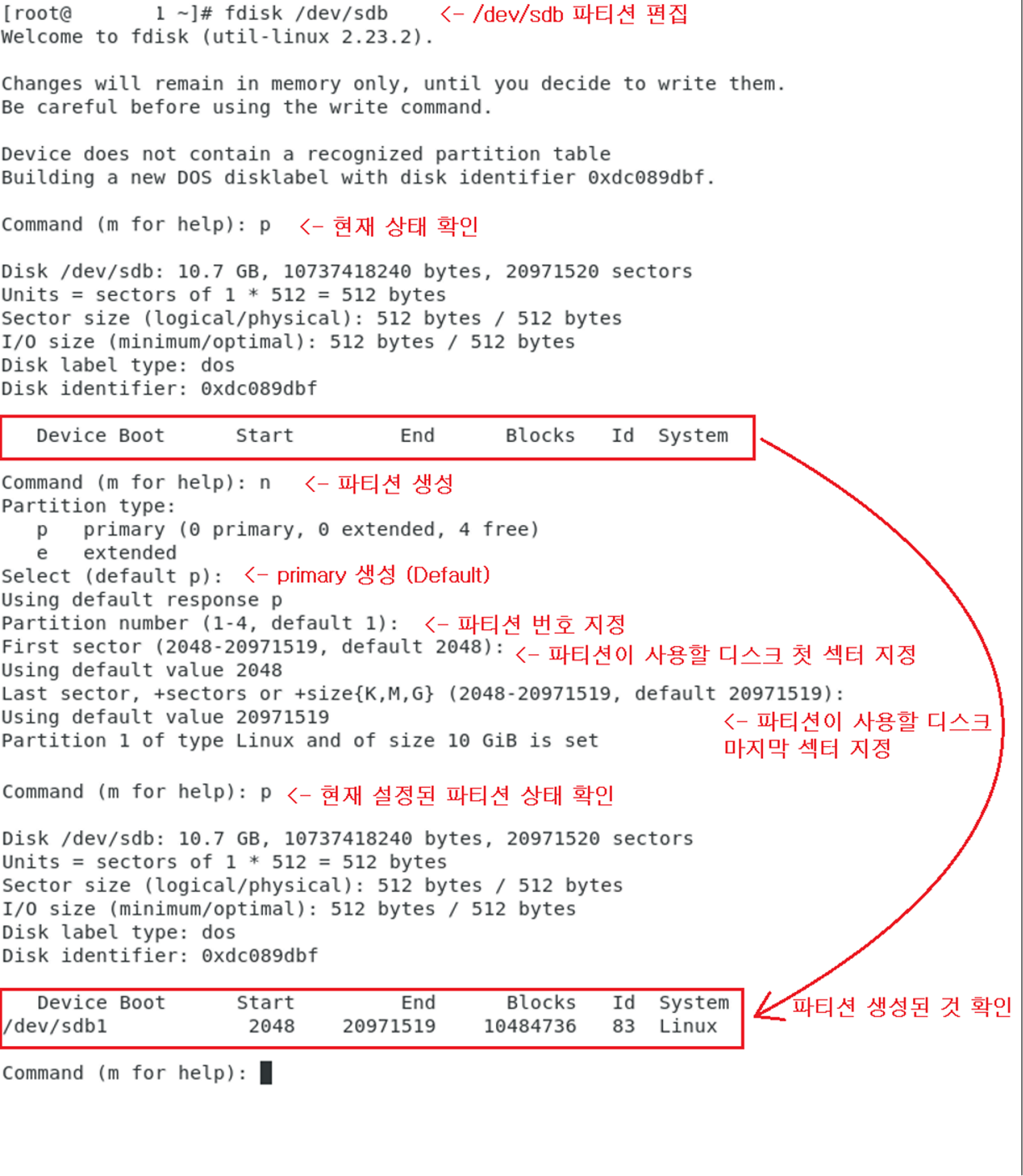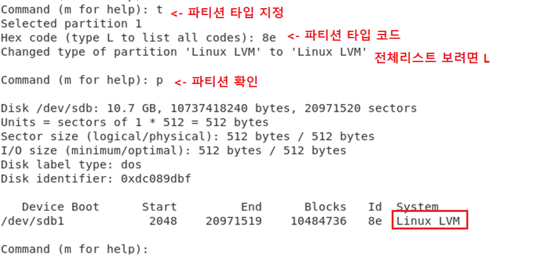 2) 빈 디스크를 fdisk로 파티션 생성 (주의! 2TB가 넘는 파티션 생성시에는 명령어가 다름)