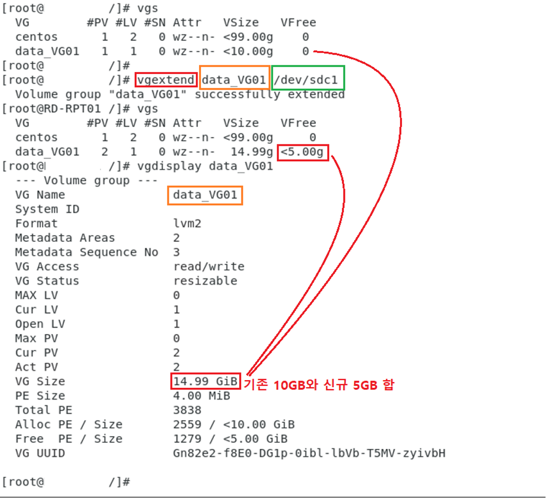 명령어 : vgextend 그룹명 PV디바이스