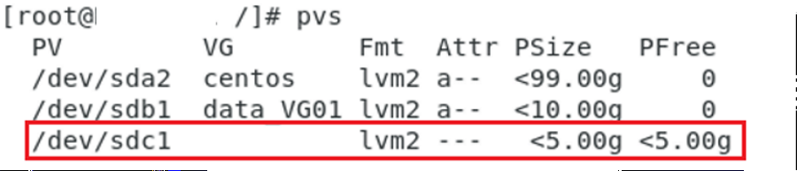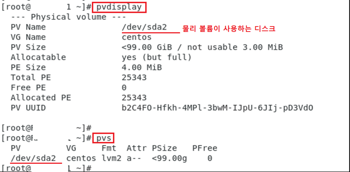 - PV 상태 확인 명령어 : pvdisplay (간단히 보려면 pvs)