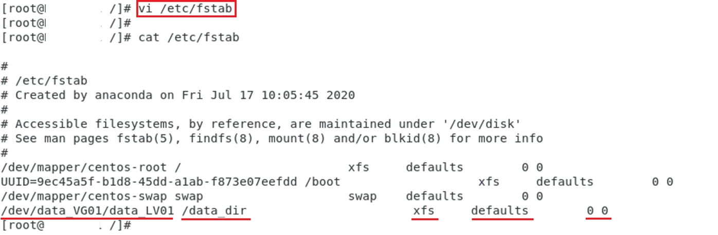 편집 내용 : LV디바이스명 디렉토리명 파일시스템타입 마운트여부(defaults) 0 0
