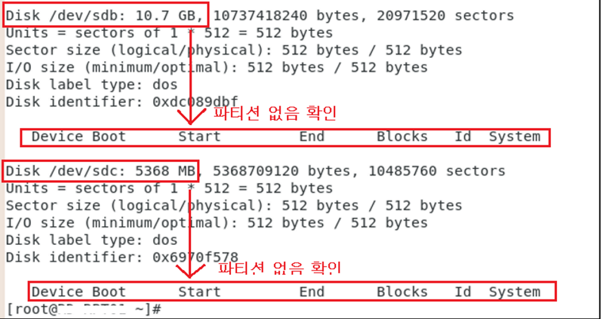 각 디스크에 파티션 생성이 안된것 확인