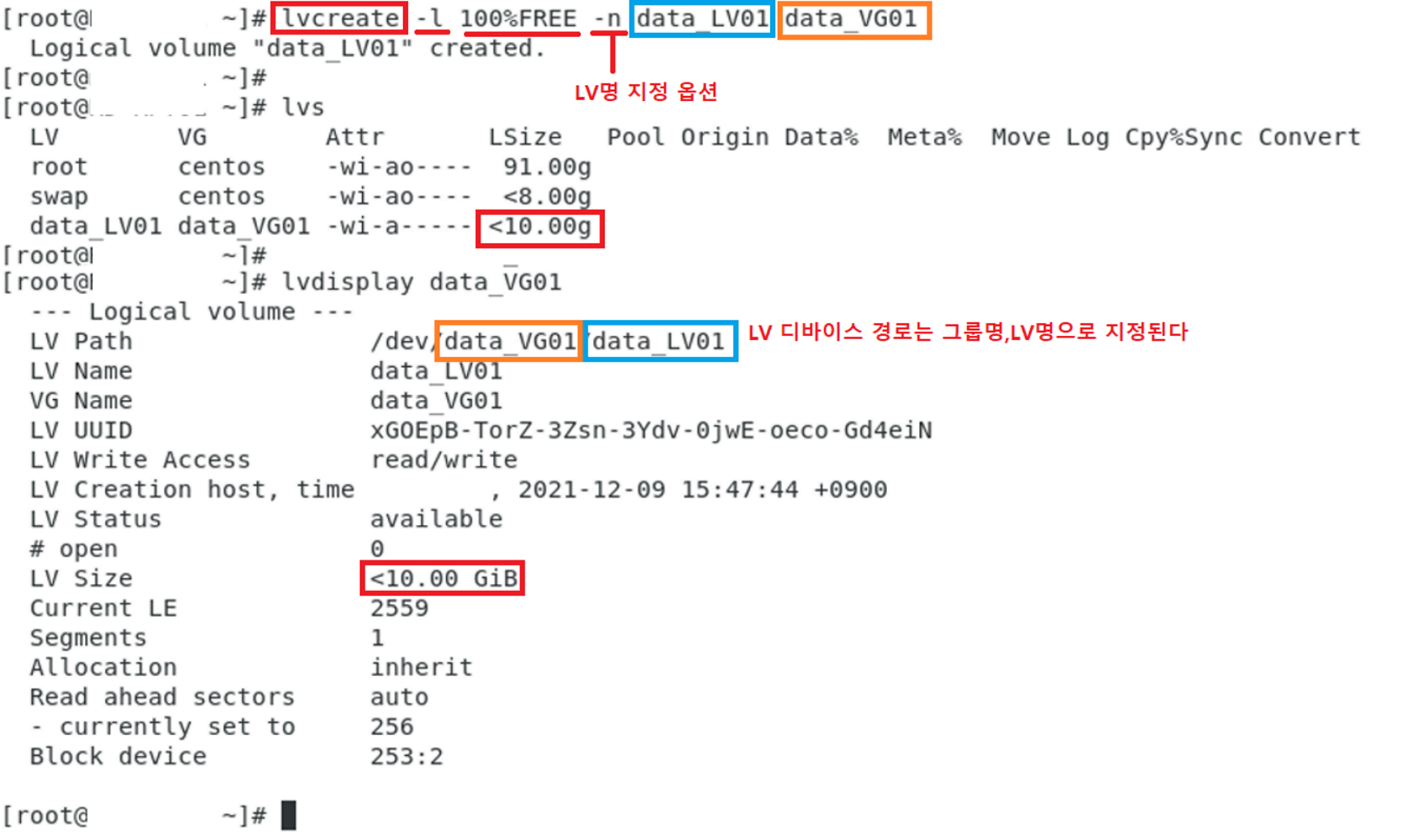 일부 용량 할당 명령어 : lvcreate -L 용량(GB,MB,KB) -n LV명 그룹명