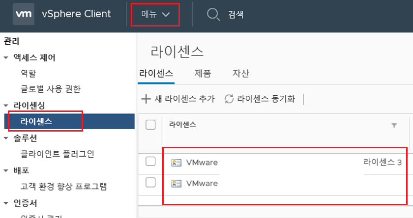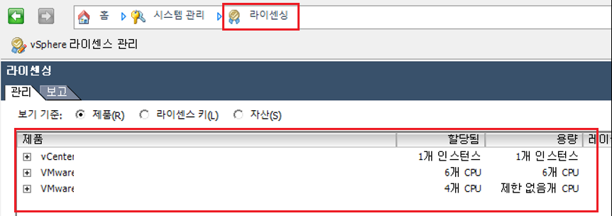 홈 > 라이선싱에서 확인 (vCenter와 ESXi와 라이선스 종류가 다를 수 있음 (클라이언트 / WEB 각각 확인방법)
