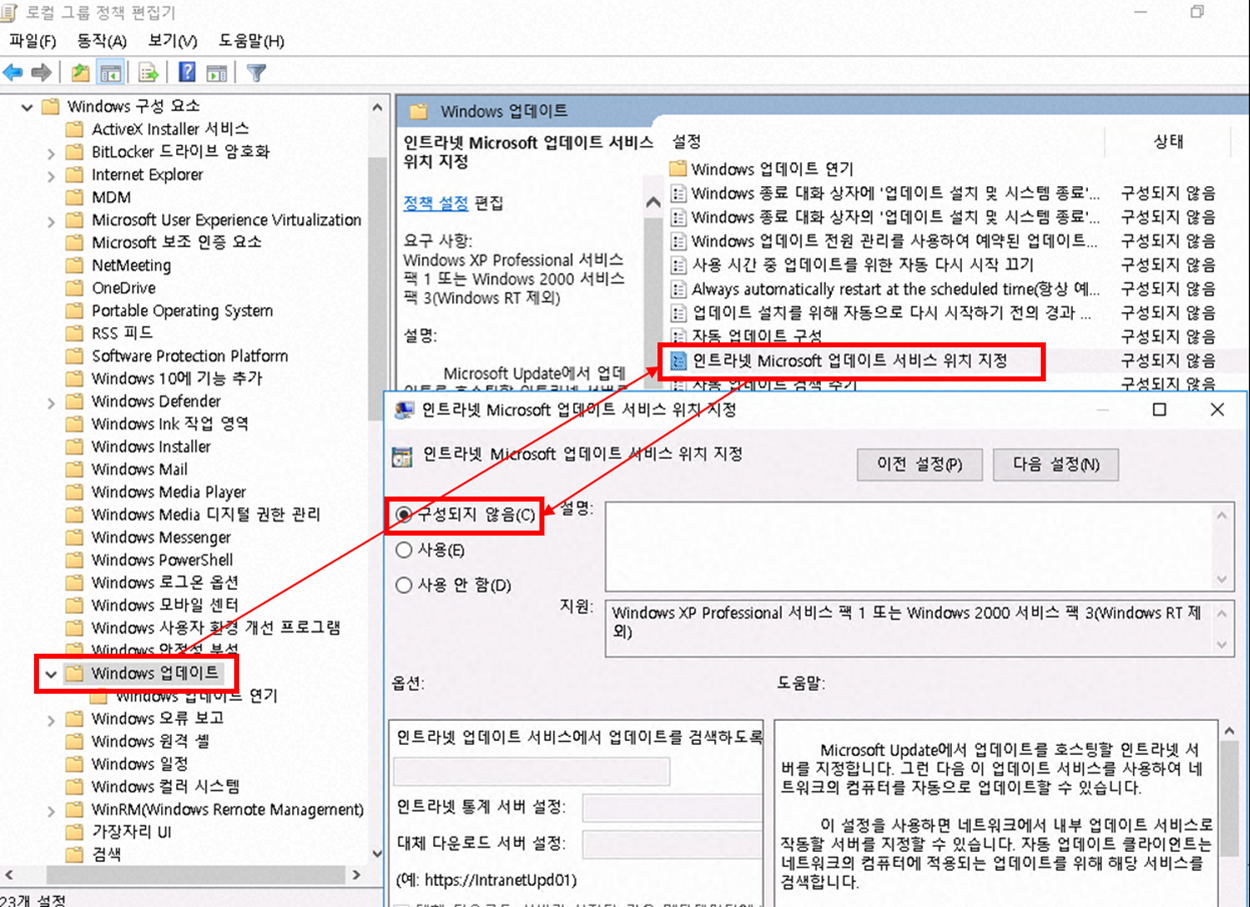 -- 위치 : 로컬그룹정책편집기(gpedit.msc) > Windows 업데이트 > 인트라넷 Microsoft 업데이트 서비스 위치 지정