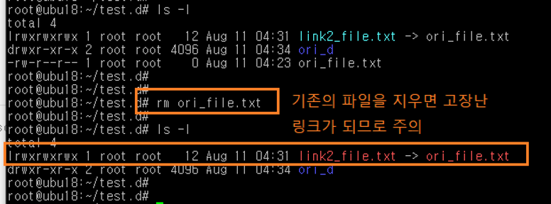 지울때는 파일 링크든 디렉토리 링크든 rm 명령으로 수행 (일반 디렉토리는 rmdir로 제거)