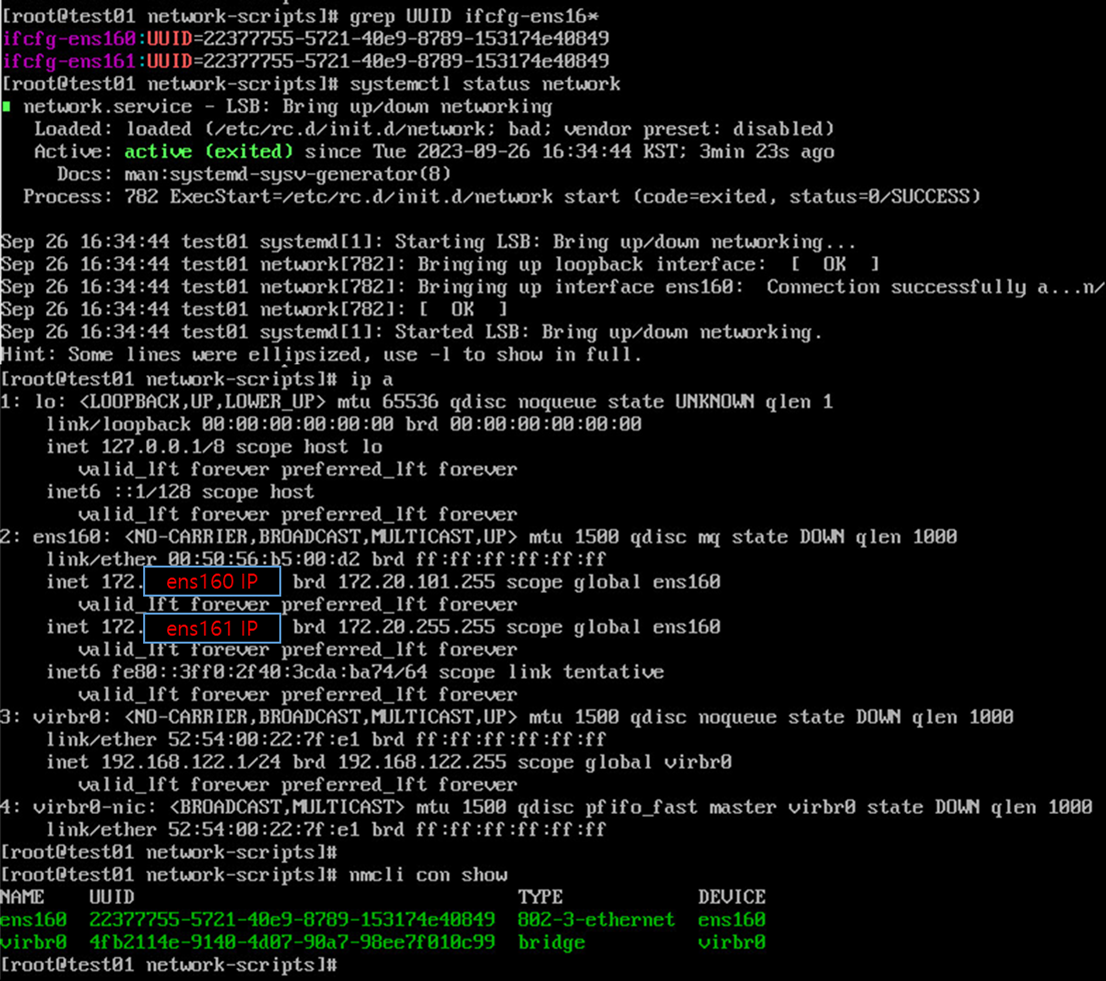 수동으로 네트워크 값이 설정된 ens160 파일을 ens161 로 복제
