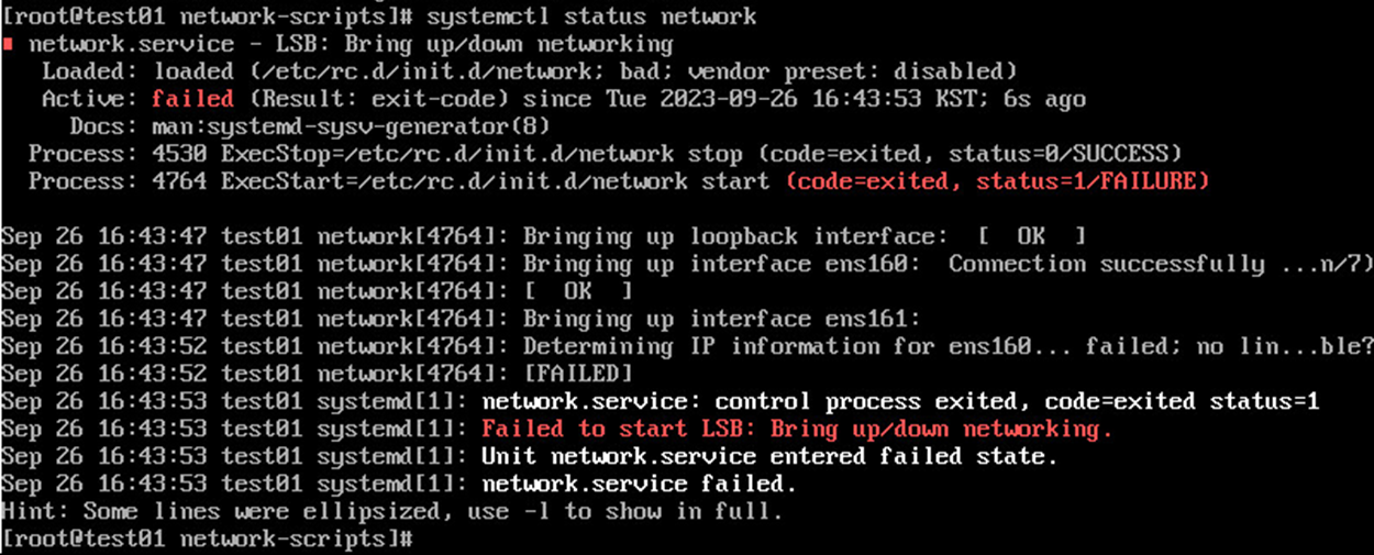 네트워크 설정 후 재시작할 때, 아래와 같이 시작이 안되는 경우가 있다.