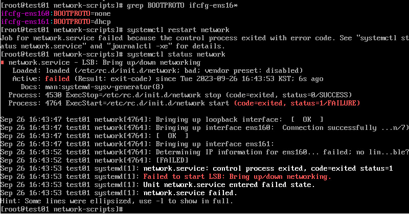 | vi /etc/sysconfig/network-scripts/ifcfg-ens161 ~ BOOTPROTO=none --> 이설정을 BOOTPROTO=dhcp 로 수정 ~ |