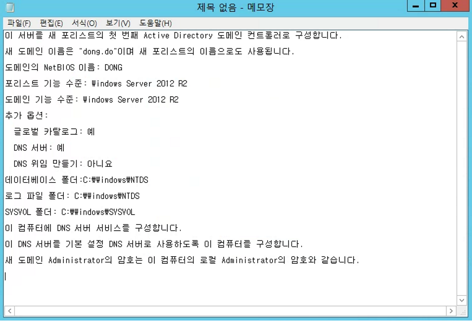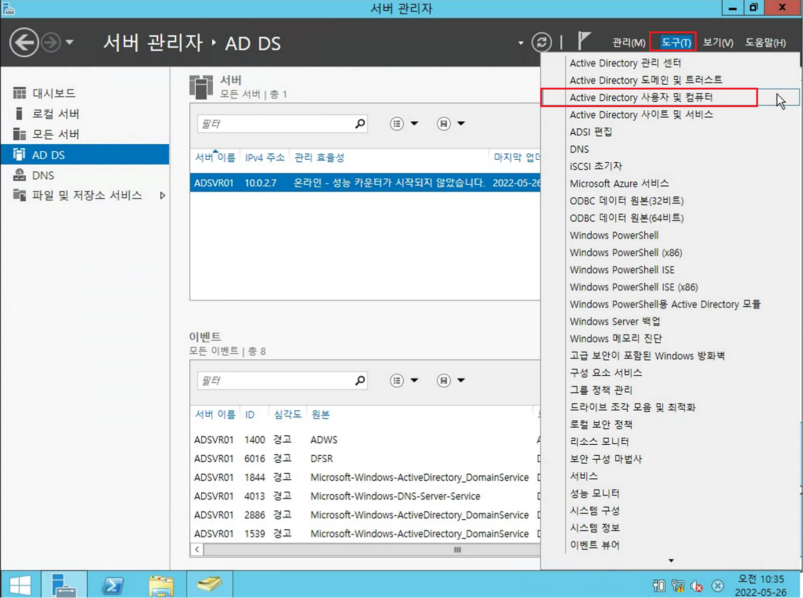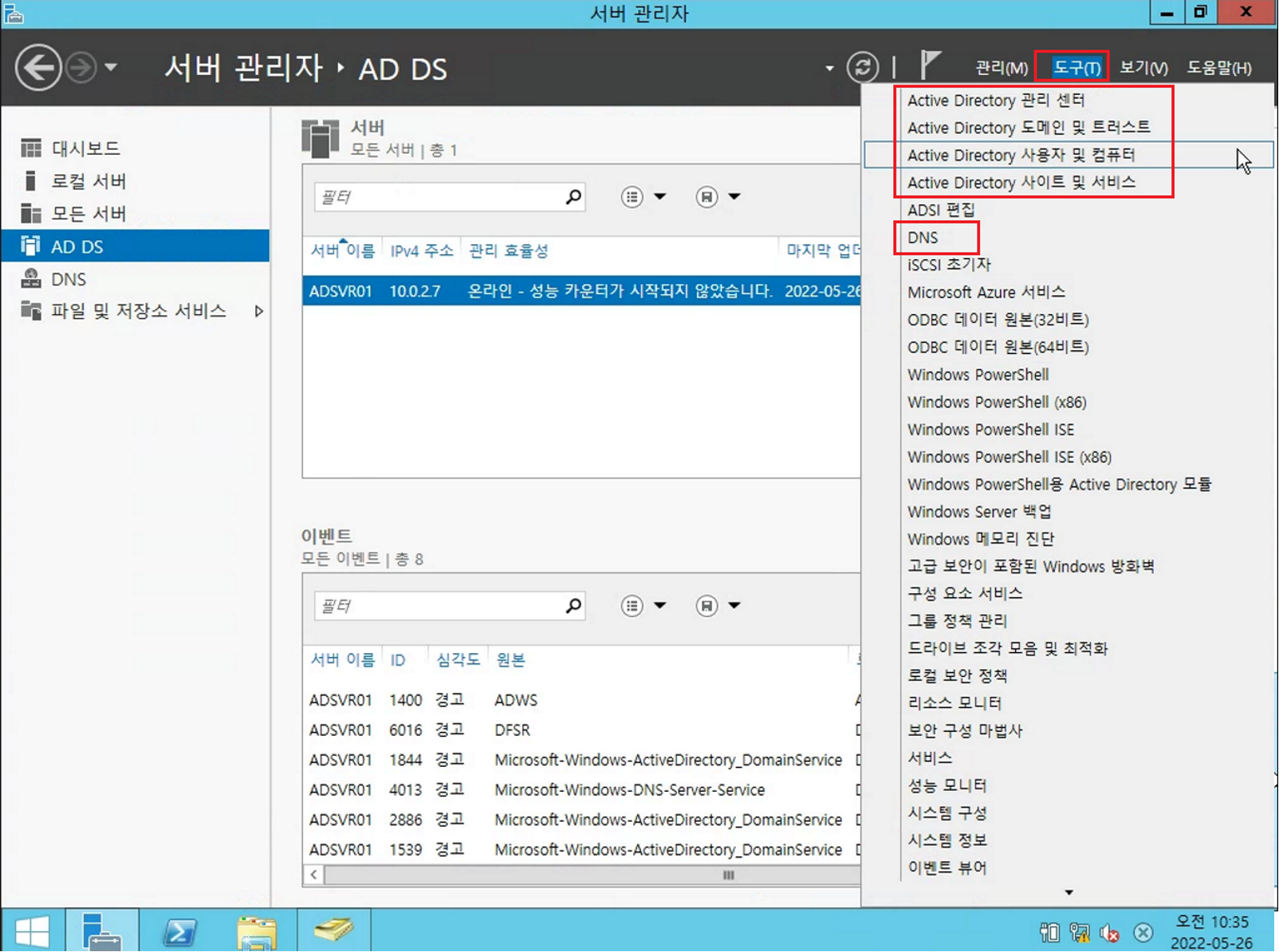 서버관리자에서 "도구" 아래에 AD, DNS 가 추가된 것 확인
