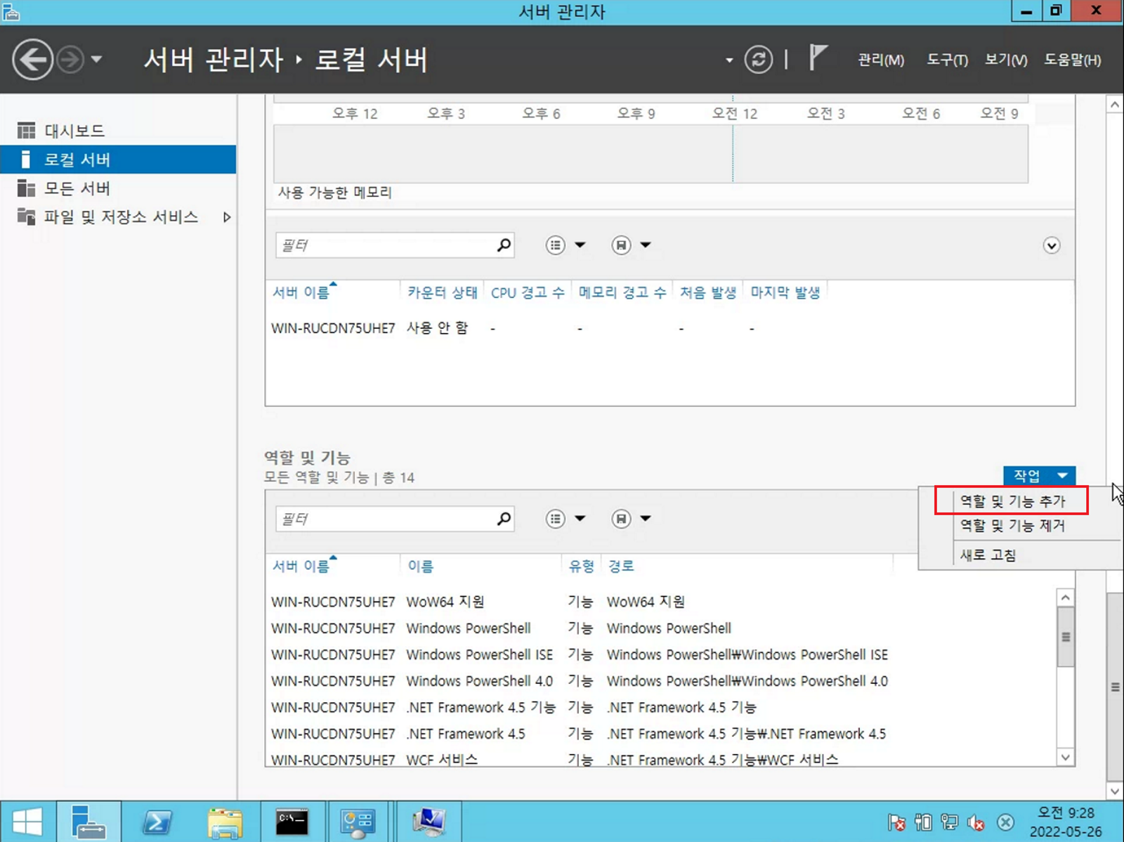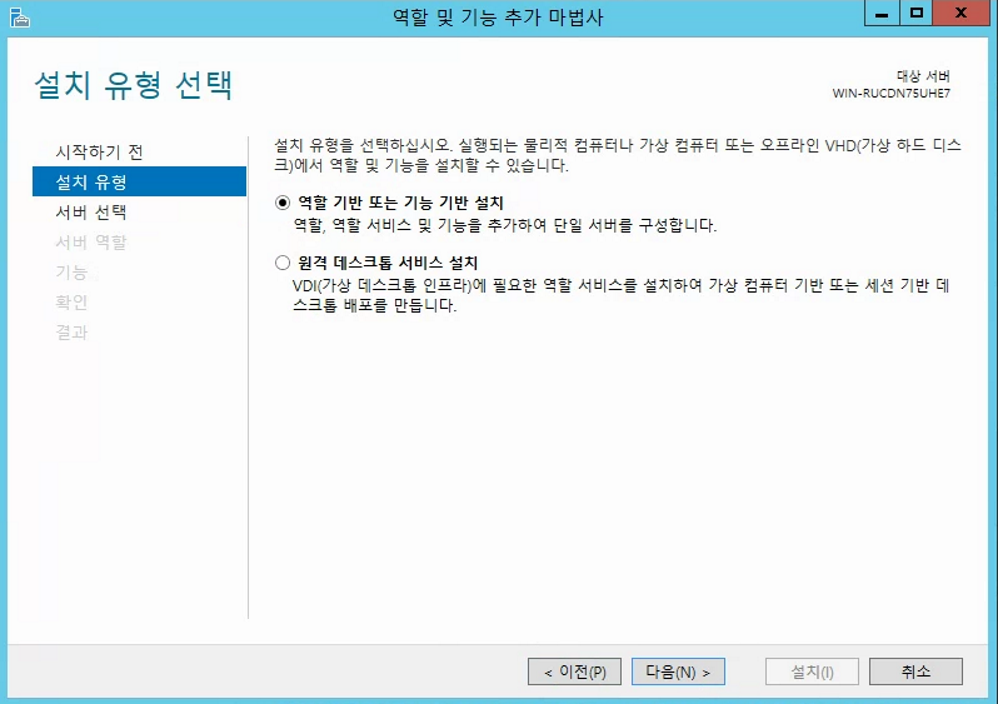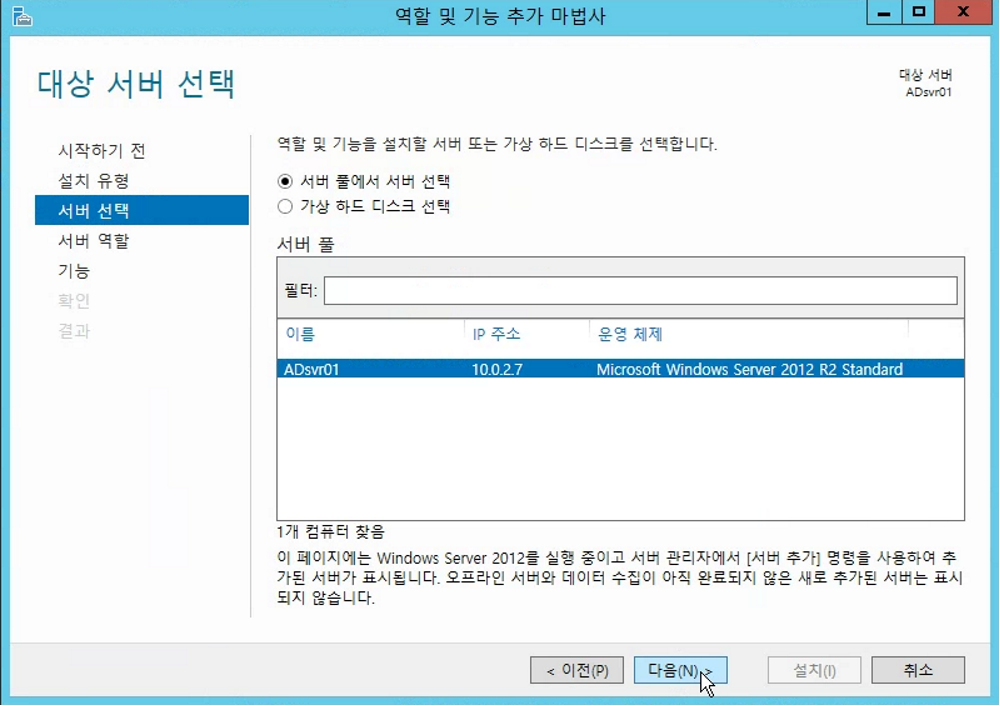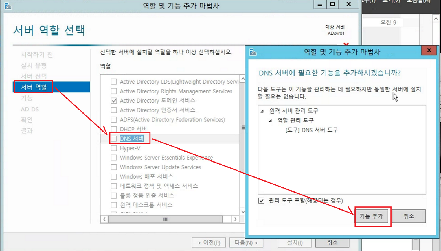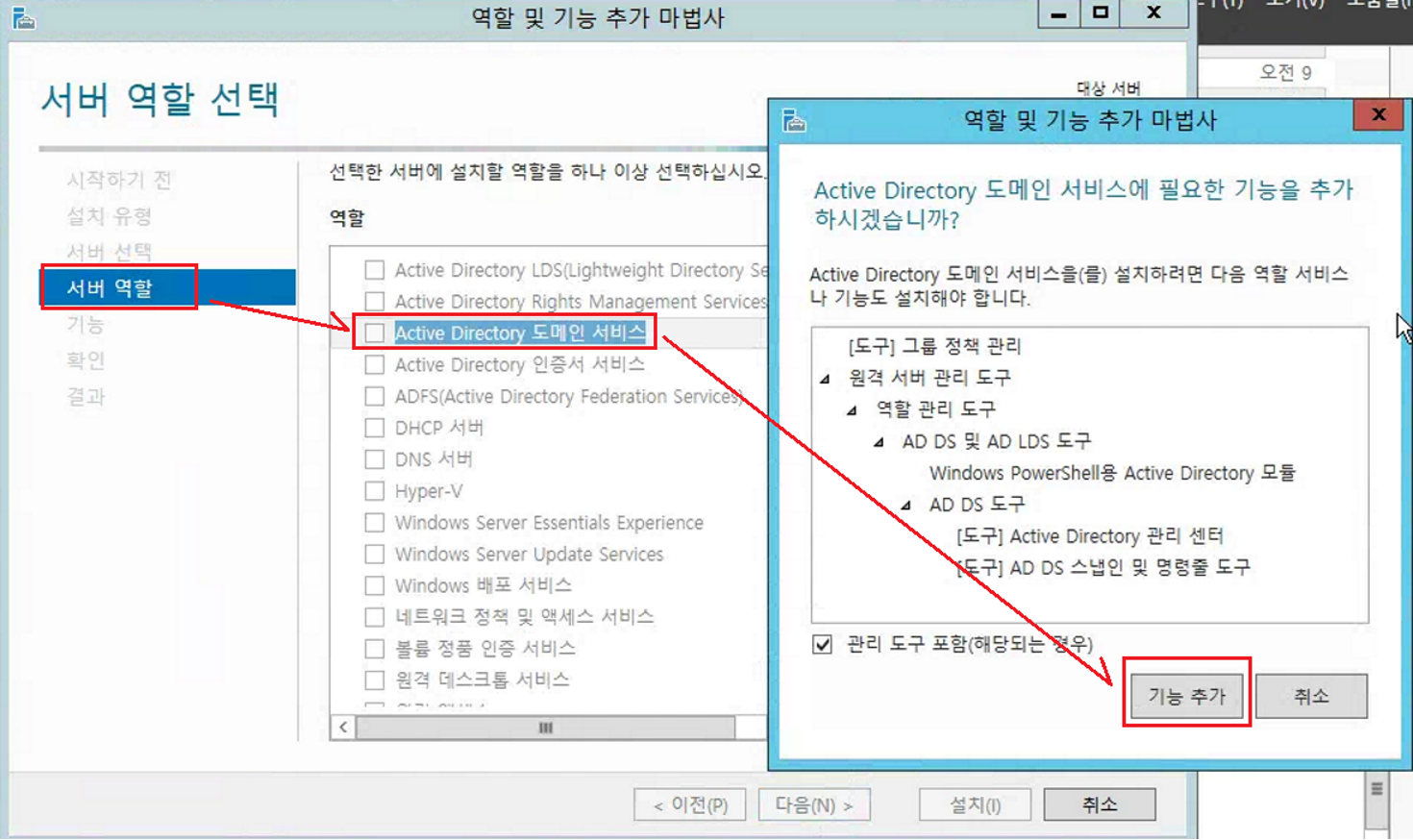 3) 서버관리자에서 "역할 및 기능 추가"로 AD 도메인 서비스와 DNS 서비스 추가
