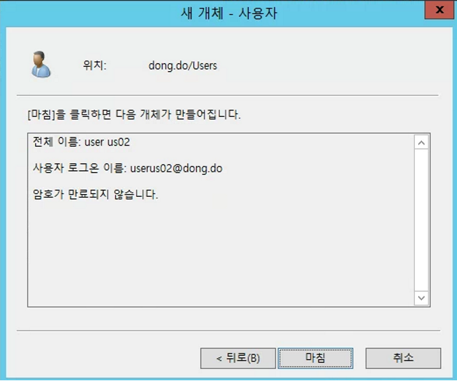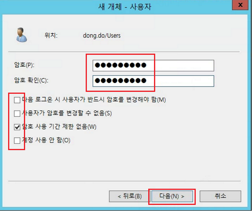 사용자 계정 패스워드의 옵션은 보안정책에 따라 체크하여 변경
