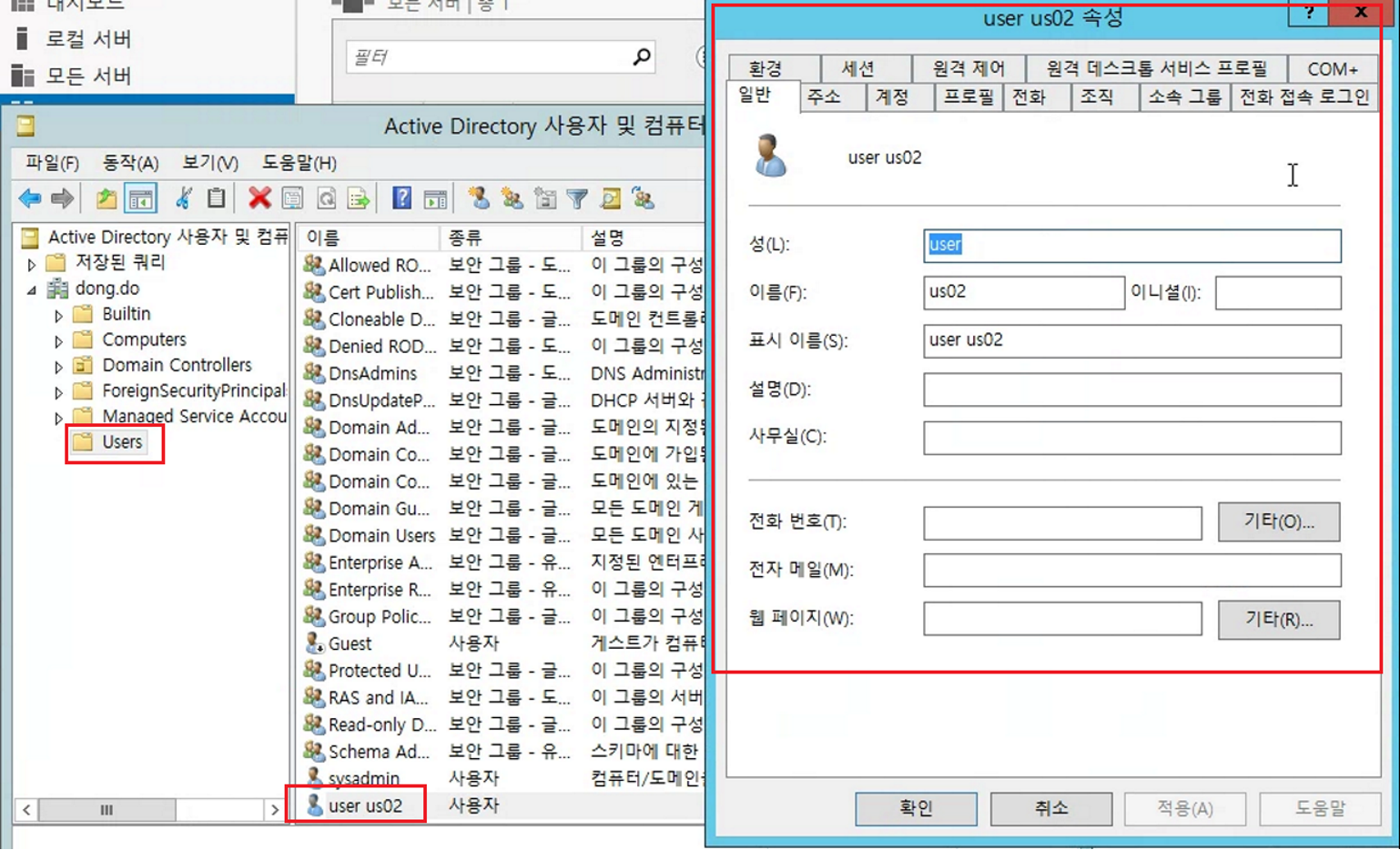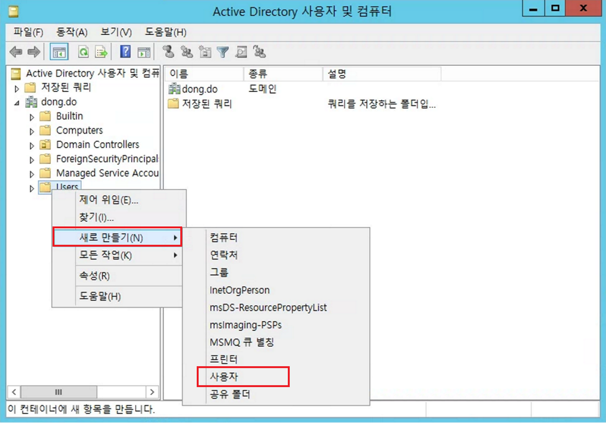 도구에서 "Active Directory 사용자 및 컴퓨터" 실행