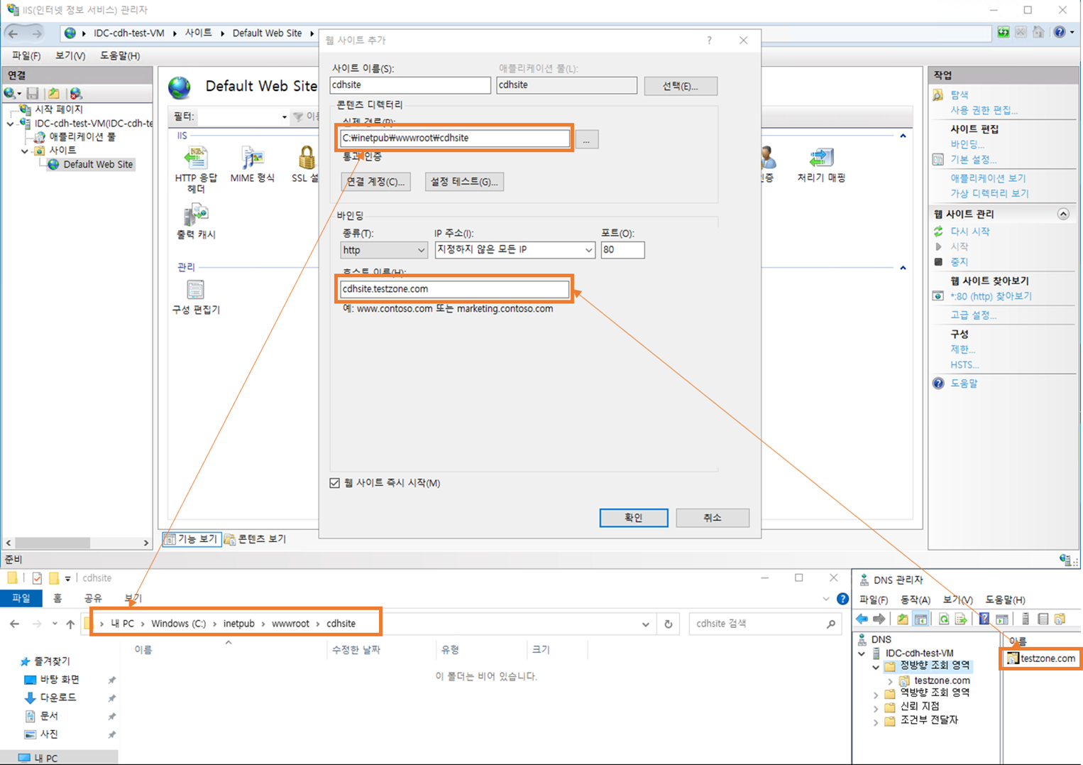 IIS 관리자에서 WEB 사이트 생성시 만든 호스트이름과 같은 A레코드 생성.