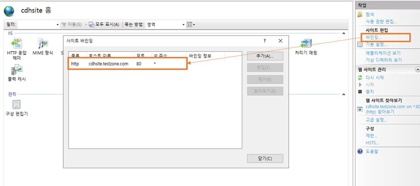 바인딩 설정도 확인하여 정상적으로 사이트가 만들어졌는지 확인