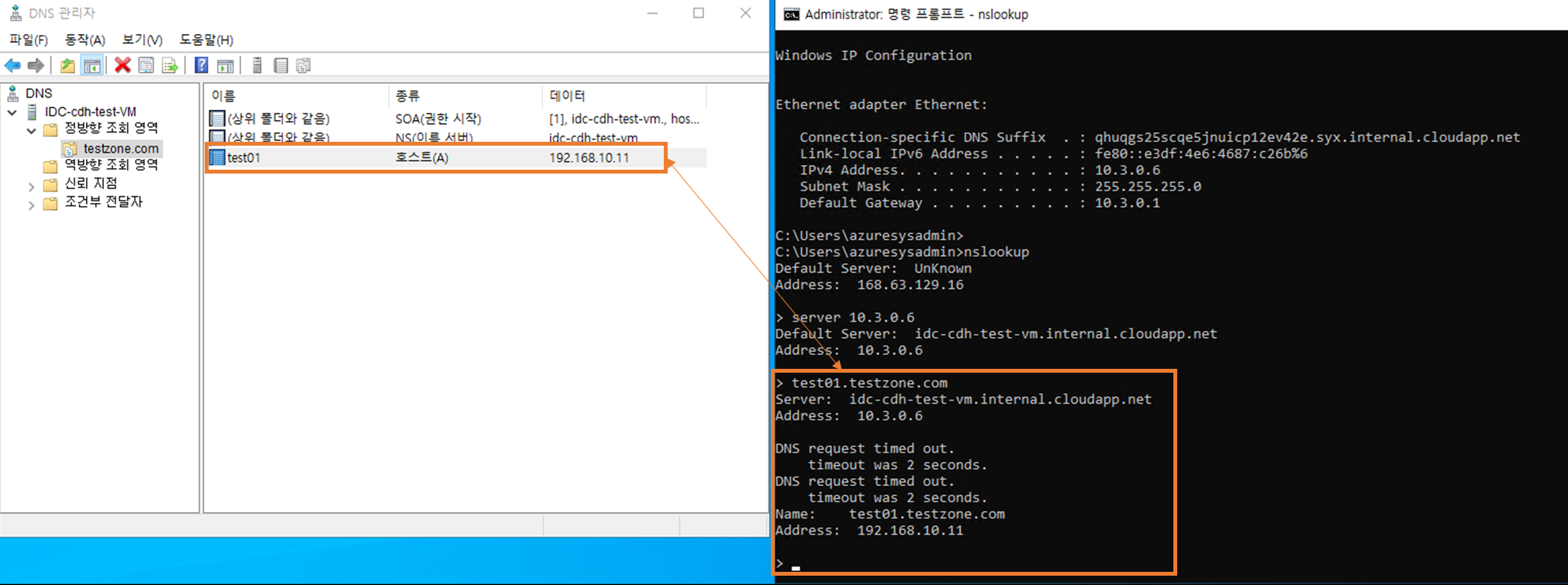 임의로 testzone.com 이라는 영역을 생성함. 호스팅 된 DNS주소가 아니기 때문에 외부에서는 접근 불가.