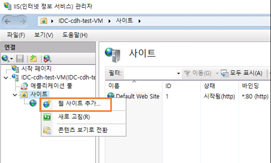 사이트에 우클릭하여 "웹 사이트 추가..." 선택
