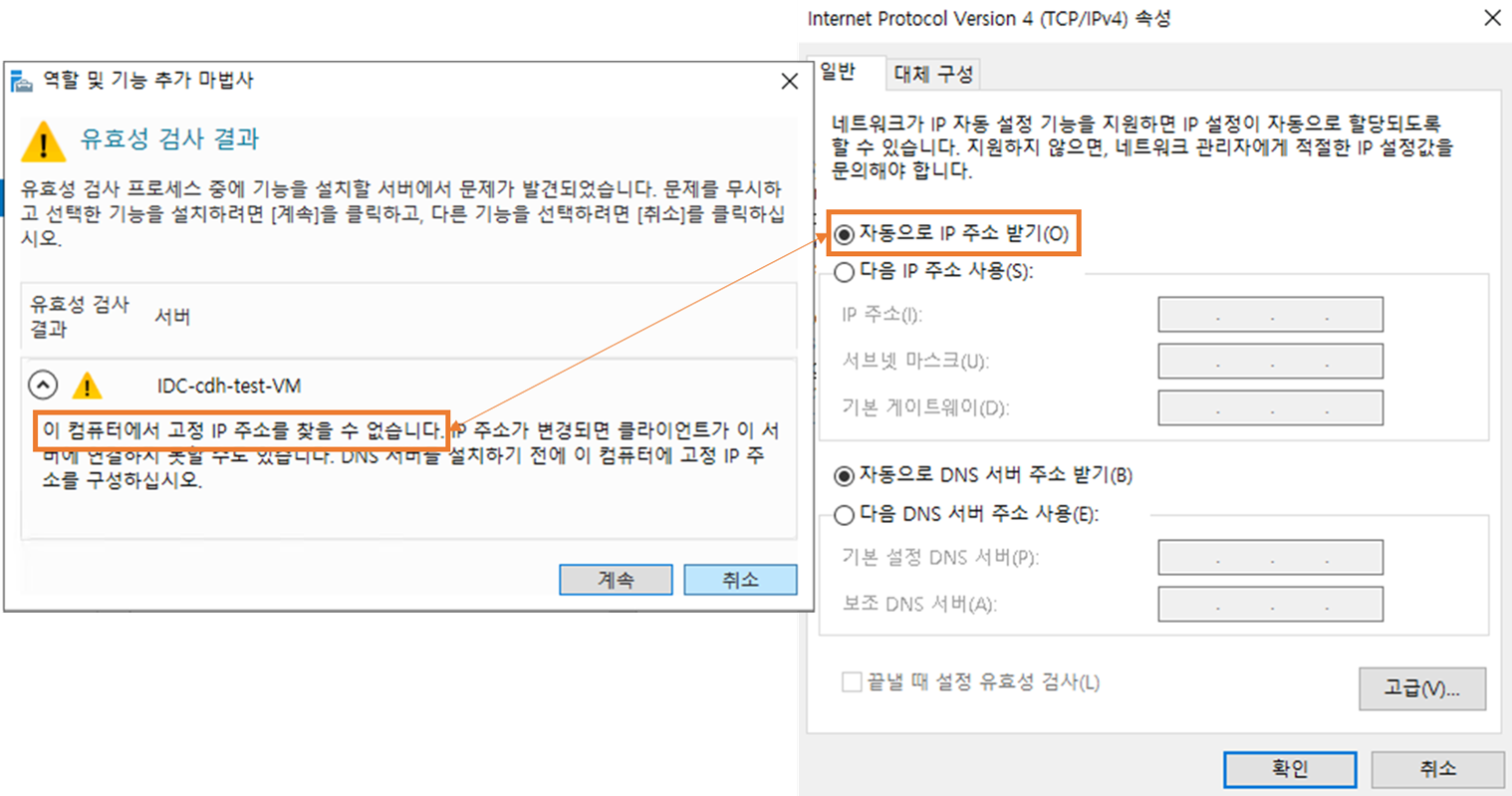그래서 OS설정은 DHCP라도 실제 사용하는 IP는 항상 정해져 있기 때문에 경고 메시지는 무시해도 된다.