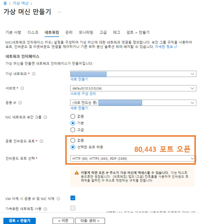 (별도의 azure 네트워크설정이 있다면 다를 수 있으니 주의)