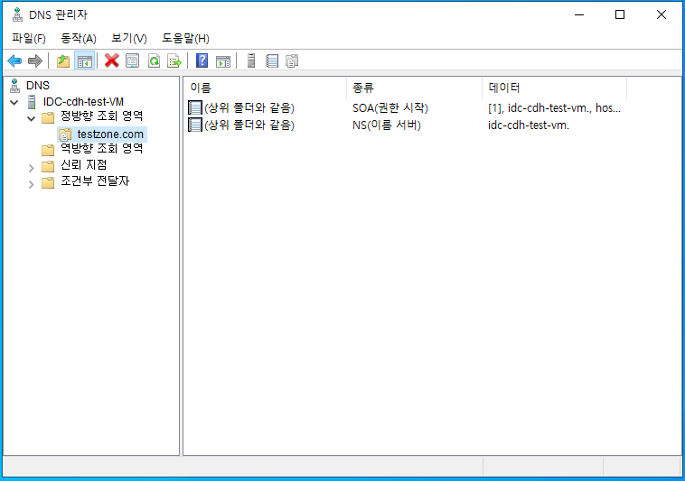 임의로 testzone.com 이라는 영역을 생성함. 호스팅 된 DNS주소가 아니기 때문에 외부에서는 접근 불가.