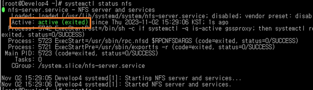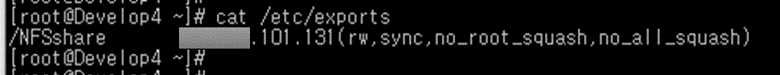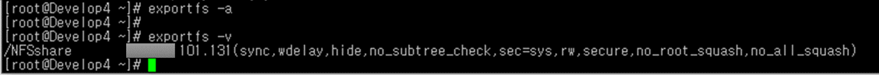 | # /etc/exports 파일 내용 전체 배포 exportfs -a # NFS 배포상태 확인 exportfs -v |
