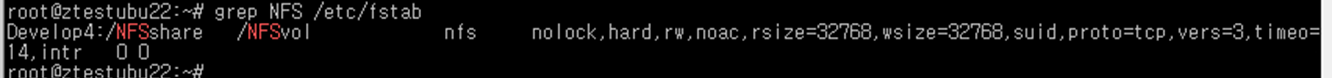 | vi /etc/fstab [NFSserverIP]:/NFSshare /NFSvol nfs nolock,hard,rw,noac,rsize=32768,wsize=32768,suid,proto=tcp,vers=3,timeo=14,intr 0 0 |
