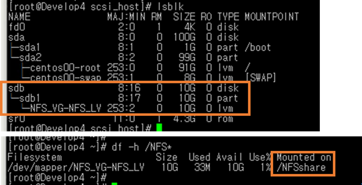 | ## 사용한 명령어 간략히 ## # 디스크 파티션 구성 fdisk /dev/sdb # pv생성 pvcreate /dev/sdb # vg생성 vgcreate NFS_VG /dev/sdb # lv생성 lvcreate -l 100%FREE -n NFS_LV NFS_VG # xfs포맷 mkfs.xfs -f /dev/NFS_VG/NFS_LV # 디렉토리생성 mkdir /NFSshare # 마운트 mount -t nfs /dev/NFS_VG/NFS_LV /NFSshare |