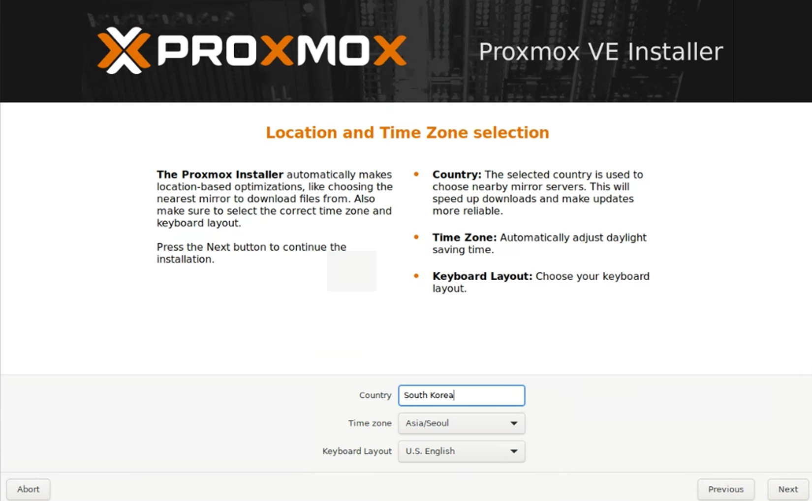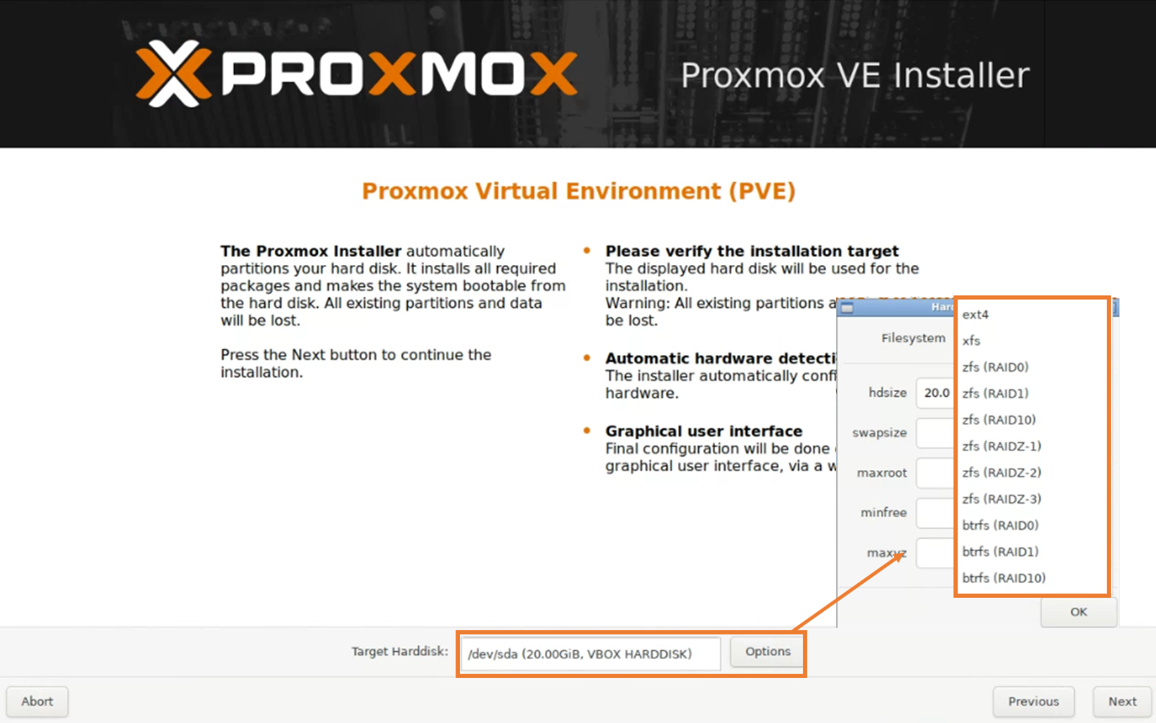 Proxmox를 설치한 디스크를 선택하고 파일시스템을 포맷한다.