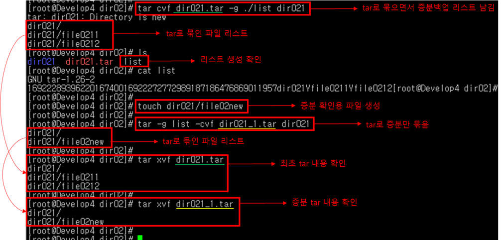 | # 최초백업 # tar cvf [full tar파일].tar -g [리스트파일] [대상파일1] [대상파일2] # 증분백업 # tar cvf [incre tar파일].tar -g [리스트파일 (풀백업시만든)] [대상파일1] [대상파일2] |