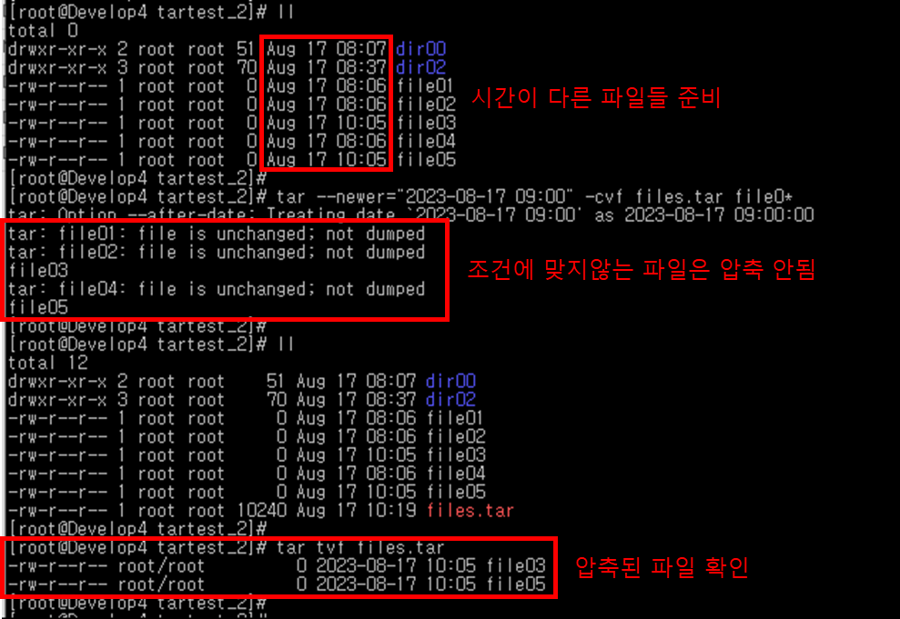 | # tar --newer="[시간]" [옵션] [tar파일].tar [대상파일01] [대상파일02] |