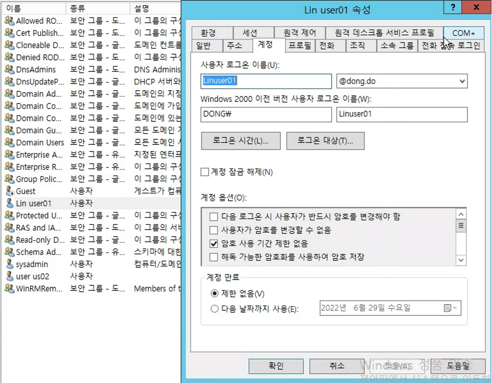 이후에 AD연결한 서버는 linuser01(uid 10000), lin02(uid 10001)
