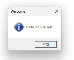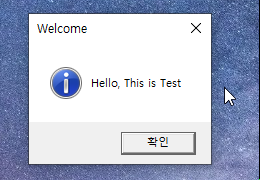 | MsgBox "Hello, This is Test", vbInformation, "Welcome" |