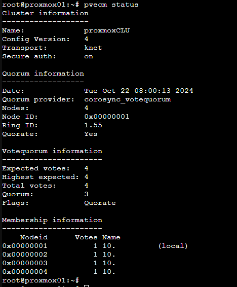 | USAGE: pvecm <COMMAND> [ARGS] [OPTIONS] pvecm qdevice remove pvecm qdevice setup <address> [OPTIONS] pvecm addnode <node> [OPTIONS] pvecm apiver pvecm create <clustername> [OPTIONS] pvecm delnode <node> pvecm add <hostname> [OPTIONS] pvecm expected <expected> pvecm keygen <filename> pvecm mtunnel [<extra-args>] [OPTIONS] pvecm nodes pvecm status pvecm updatecerts [OPTIONS] pvecm help [<extra-args>] [OPTIONS] |