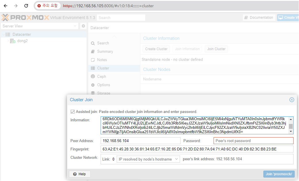 6) 클러스터 Join 패스워드 입력. 패스워드는 1번 노드의 root password