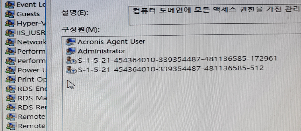 - 로컬 컴퓨터의 사용자 그룹 관리 화면에서는 AD 이름이 정상적으로 표시되지 않고 SID만 나오는 경우가 있음.