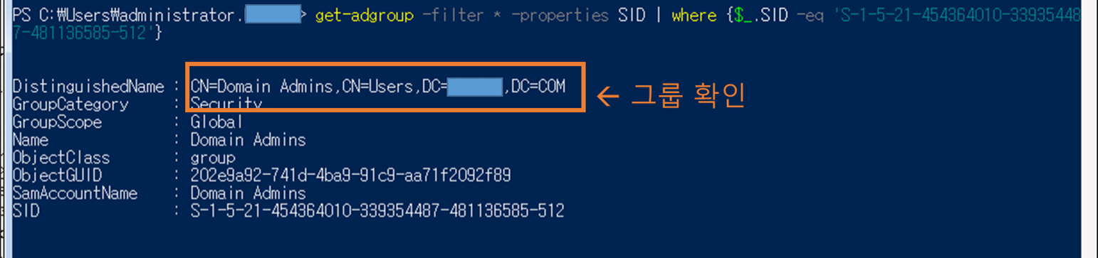 get-adgroup -filter * -properties SID | where {$_.SID -eq 'SID번호'}