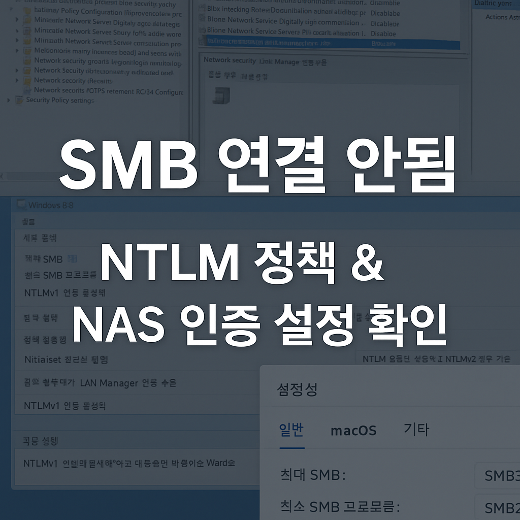 📛 안 될 때 증상Windows 서버 또는 NAS 장비와 SMB로 연결하려 할 때 연결이 되지 않는 증상이 발생함.포트통신은 모두 성공하는데 계정정보를 입력하여 연결시 계속 암호가 잘못되었다고 메시지 나옴. 🔍 되는 서버 vs 안되는 서버 비교다음은 SMB 연결이 가능한 서버와 그렇지 않은 서버의 그룹 정책 설정 차이를 비교한 화면임.cmd > secpol.msc 특정 정책(GPO)이 적용된 서버에서만 SMB 연결이 차단됨을 확인함.특히 구형 NAS에서 사용하는 SMB1 또는 NTLMv1 인증 방식이 차단되어 있었음.📌 확인된 정책 내용정책 항목: Microsoft 네트워크 보안: NTLM SSP 기반 서버 인증 수준해당 정책이 활성화되어 있을 경우 NTLMv1 인증을 거부함.이 설정은 GPO로 강..