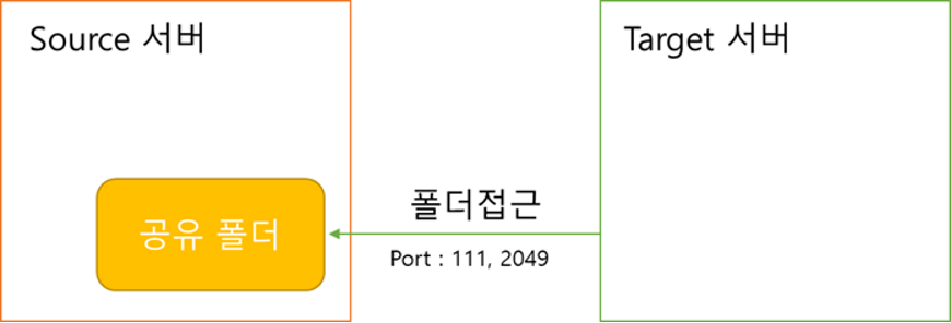 서버끼리 파일 공유를 하는 여러가지 방법중에 NFS공유를 만들어서 서로 같은 데이터를 바라보는 방법이 있다. 마치 윈도우에서 공유폴더를 만드는것과 같다. [테스트 환경 구성] A서버(Server)에서 B서버(Client)로 NFS를 이용한 공유 구성 테스트 1) 서로 통신이 가능한 네트워크환경에 서버 2대 설치 - NFS Server OS: CentOS7.6 IP: XXX.XXX.101.133 - NFS Client OS: Ubuntu22.04 IP: XXX.XXX.101.131 2) Server, Client 모두 nfs 관련 패키지가 설치되어있는지 확인 # CentOS 명령어 rpm -qa | grep nfs-utils # Ubuntu 명령어 sudo dpkg -l | grep nfs-common 3..