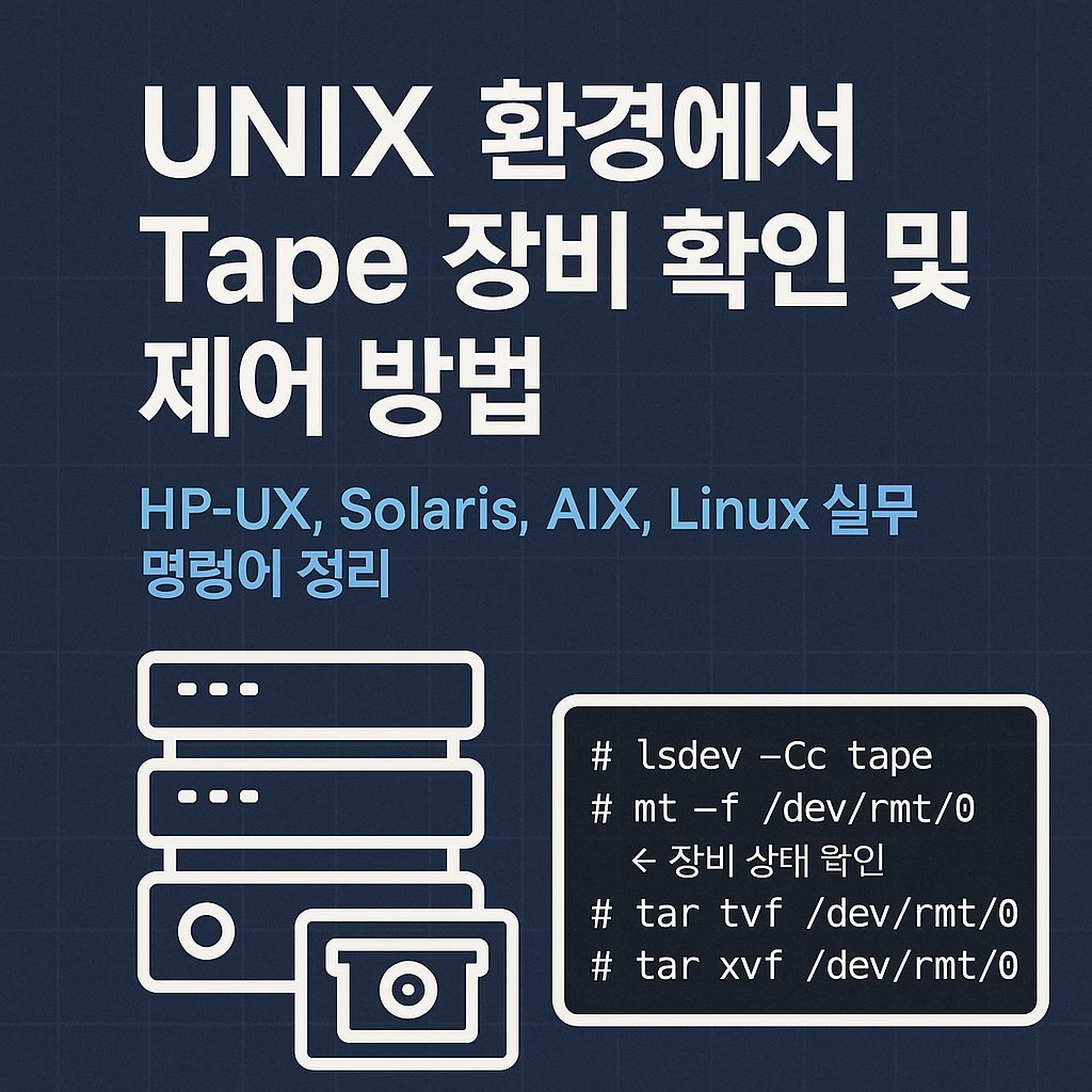 레거시 시스템에서 여전히 Tape 장비를 사용하는 환경이 존재함.본 포스트는 HP-UX, Solaris, AIX, Linux 시스템에서 Tape 장비를 식별하고 제어하는 실무 명령어를 정리한 자료임.📌 1. HP-UX 환경에서 Tape 장치 확인# ioscan -fnC tapeClass I H/W Path Driver S/W State H/W Type Description==================================================================tape 0 0/0/0/3/1.4.0 stape CLAIMED DEVICE HP DAT160 /dev/rmt/0m /dev/rmt/0mn /dev/rmt/c3t..